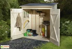 Les cloisons de cet abri de jardin en bois intègrent une porte de 85 x 195 cm ainsi qu’une fenêtre permettant de bénéficier d’un peu de luminosité à l’intérieur du cabanon. A noter également, la présence d’un plancher de 19 mm d’épaisseur permettant d’isoler le sol des remontées d’humidité qui pourrait endommager le contenu de l’abri.