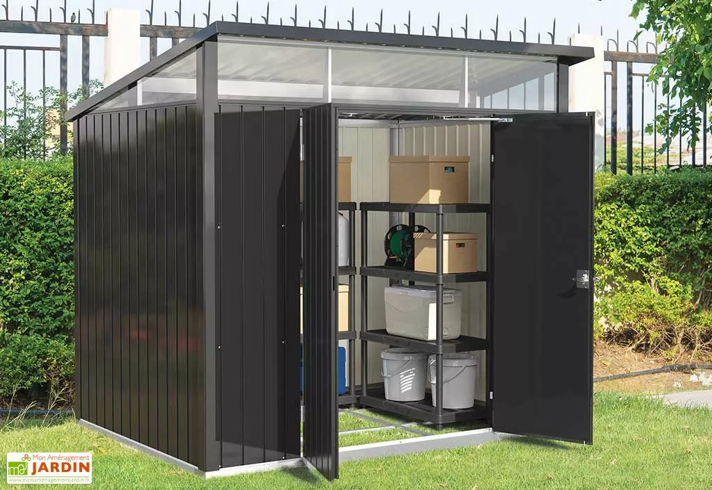 Conçu pour ne craindre ni les intempéries, ni l’humidité, ce cabanon de jardin est fabriqué en acier galvanisé, un matériau robuste insensible à la corrosion. Aucun entretien ni traitement du métal ne sont alors à prévoir. Les parois de 0,5 mm d’épaisseur de cette cabane de jardin intègrent par ailleurs un puits de lumière et soutiennent une toiture monopente dont l’inclinaison, associée à un système de gouttière, permettra le bon écoulement des eaux pluviales en cas d’averse.