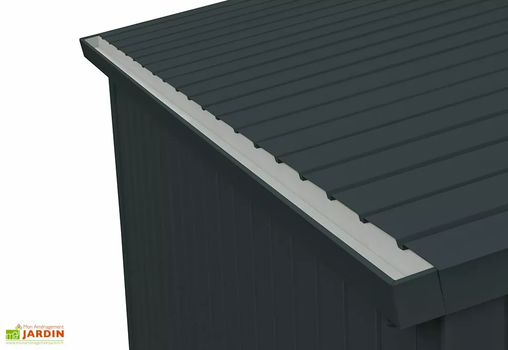 Pour éviter la condensation et profiter d’une bonne circulation de l’air, l’abri de jardin en métal est équipé d’aération sur les côtés. Une gouttière située à l’arrière permet de récolter l’eau de pluie. Le système d’évacuation de l’eau de pluie est compris. N’hésitez pas à installer une descente de gouttière pour pouvoir récolter l’eau de pluie.