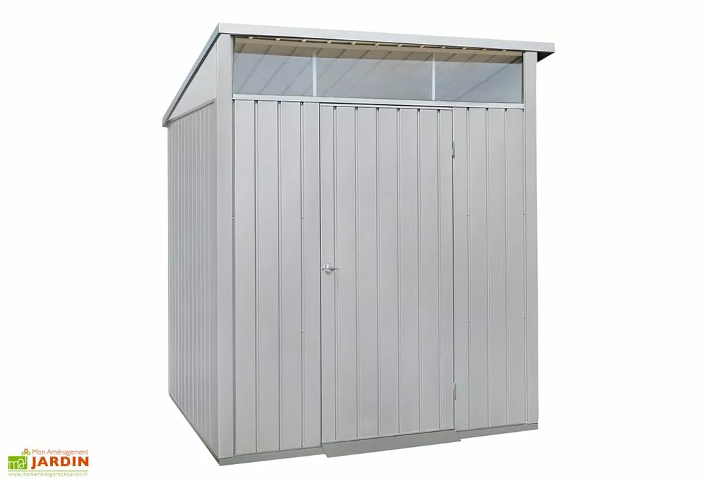 La cabane en métal dispose d’une toiture en pente et mesure 2,29 m de hauteur à l’avant et 1,88 m de hauteur à l’arrière. La hauteur intérieure à l’avant de l’abri est de 2,22 m. L’avancée de toit Skylight permet d’offrir un puits de lumière naturelle à l’abri.