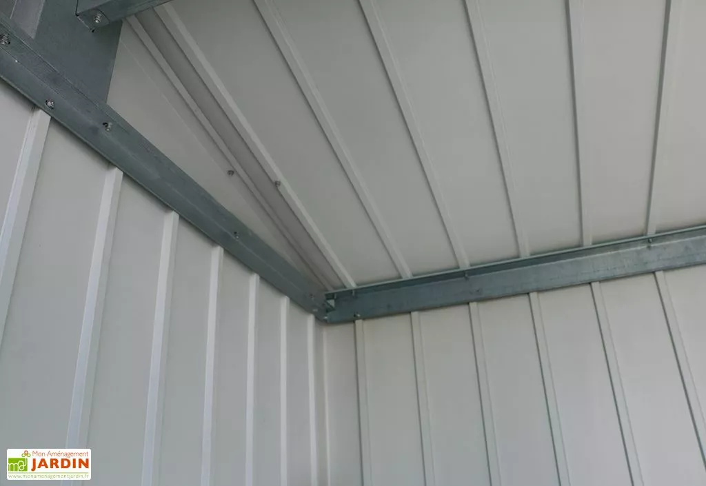 L’abri de jardin en acier galvanisé est recouvert d’une peinture gris clair, RAL 9006. L’acier est galvanisé à chaud, et offre une excellente résistance face à la corrosion, la galvanisation à chaud étant plus efficace que la galvanisation classique. Il ne demande ainsi aucun entretien et garde le même aspect pendant longtemps.