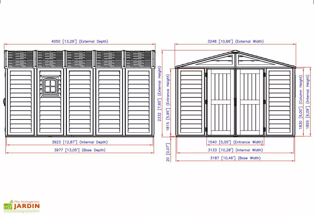 L’abri de jardin mesure 4,05 m de longueur, 3,25 m de largeur et 2,33 m de hauteur. Sa grande hauteur sous toit vous permet de rester à l’intérieur sans avoir à vous courber. Ses dimensions intérieures sont de 3,92 m de longueur et 3,13 m de largeur, offrant ainsi une surface utile de 12,29 m².