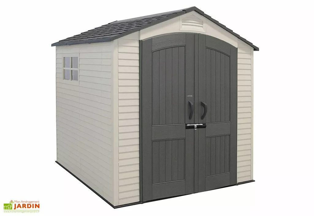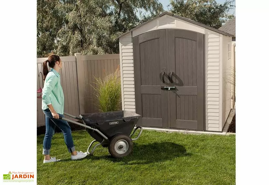 L’abri de jardin de chez Lifetime est en polyéthylène haute densité, un matériau qui résiste parfaitement à la moisissure, aux insectes et à la corrosion et qui ne demande aucun entretien. Il est renforcé par une charpente triangulée en A en acier inoxydable. Il s’installe sans problème en bord de mer ou à la montagne. Sa toiture possède une pente de 42% soit 22,6°.