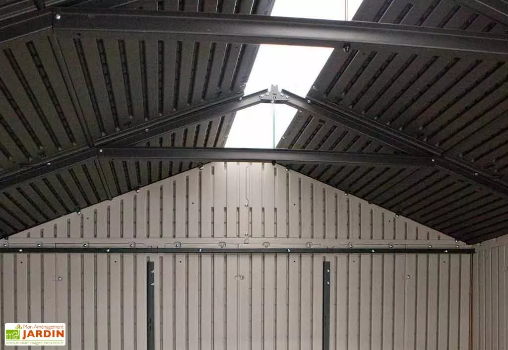 Labri de jardin dispose d’une grande double porte de 1,38 m de largeur et 1,92 m de hauteur, d’un puits de lumière, de 2 bouches d’aération et d’une fenêtre à ouverture verticale (32 x 58 cm).