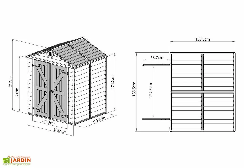 La cabane mesure 153,5 cm de profondeur, 185,5 cm de largeur et 217 cm de hauteur. Elle offre une surface de 2,85 m² vous permettant de stocker vos outils, votre mobilier de jardin, vos vélos ou encore votre tondeuse. Elle est équipée d’une grande double porte de 127,5 x 171 cm (l,h) équipée d’un loquet pour la verrouiller avec un cadenas (non inclus). Son seuil bas permet de faire entrer facilement vos différents équipements en les faisant rouler.