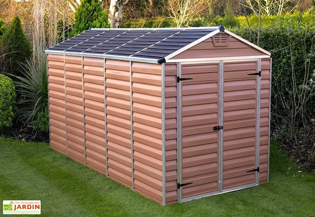 L’abri de jardin en polycarbonate Skylight de chez Palram-Canopia possède une structure en aluminium qui lui confère une solidité et une stabilité importante. Il mesure 380 cm de profondeur, 185,5 cm de largeur et 217 cm de hauteur, ce qui lui offre une belle superficie de plus de 7 m². Il est équipé d’une grande double porte verrouillable (cadenas non inclus) de 127,5 x 171 cm (l,h).