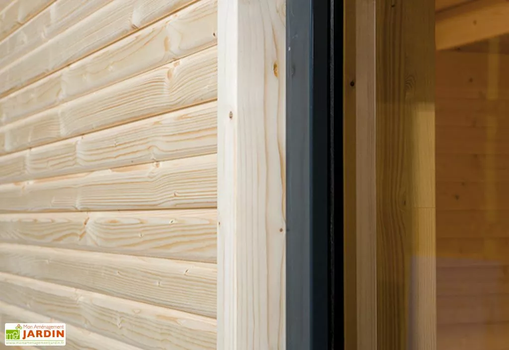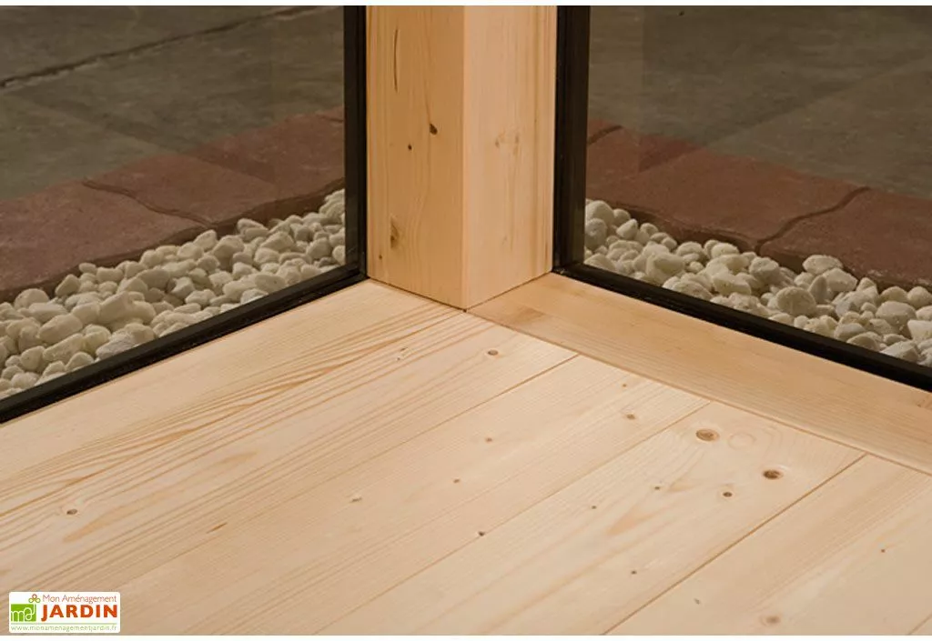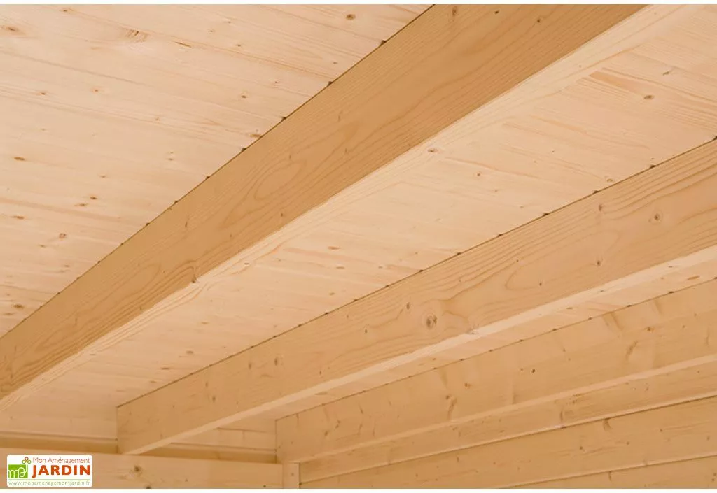 Une des parois du bungalow en bois est vitrée grâce à la porte et 3 fenêtres de 1,88 m de hauteur et de 86 cm de largeur. Il dispose également d’une fenêtre oscillo-battante. Un plancher en bois massif de 19mm d’épaisseur est également compris dans la livraison. Le toit du bungalow est en bois de 19 mm d’épaisseur. Il est recouvert d’un film le protégeant de la pluie et d’un profilé de finition en aluminium.