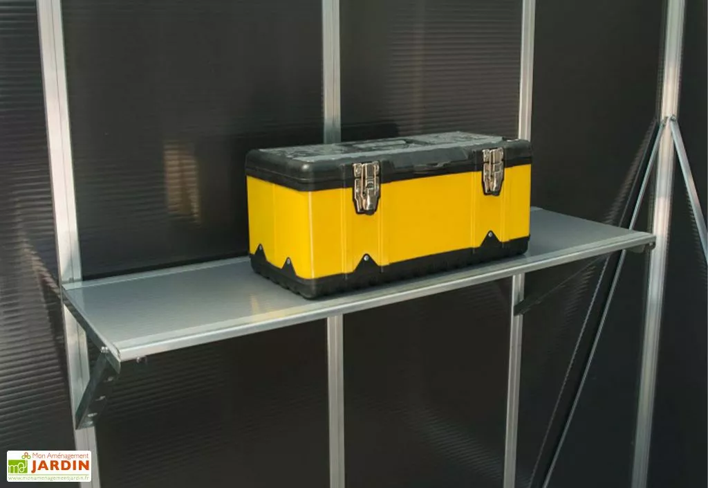 Une étagère dispose de 2 profilés en aluminium et de 2 supports en acier galvanisé offrant une solidité accrue et un maintien optimal de cet accessoire pour abri de jardin Yukon. La quincaillerie est fournie pour chaque étagère.