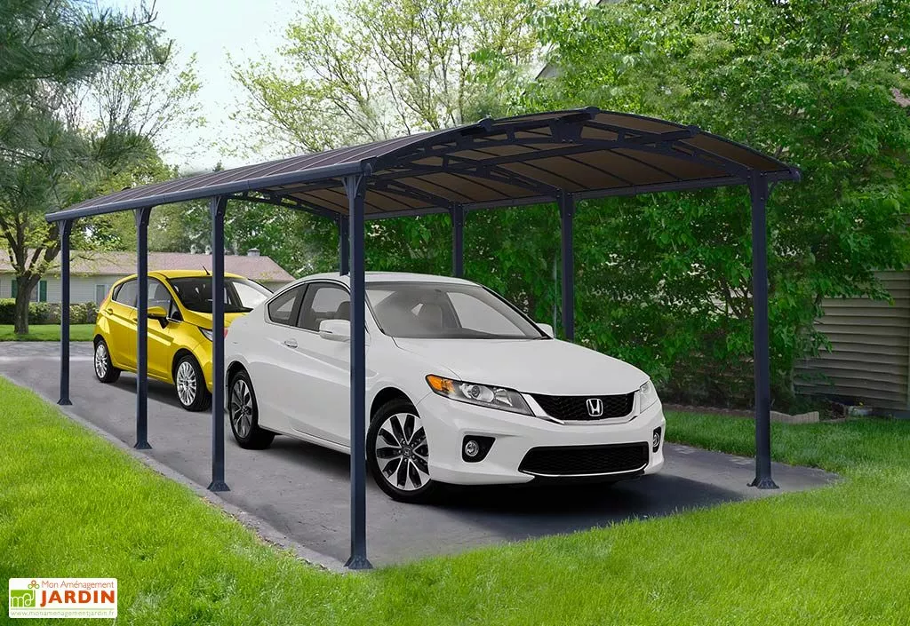 Le carport Arcadia 8500 de la marque Palram-Canopia associe l’aluminium au polycarbonate afin d’offrir à vos véhicules une protection efficace contre les intempéries et les rayons UV. Avec des dimensions de 3,59 x 8,58 m, pour 2,19 m de haut, il couvre une surface de 30,8 m² et offre suffisamment d’espace pour stationner aisément deux voitures.
