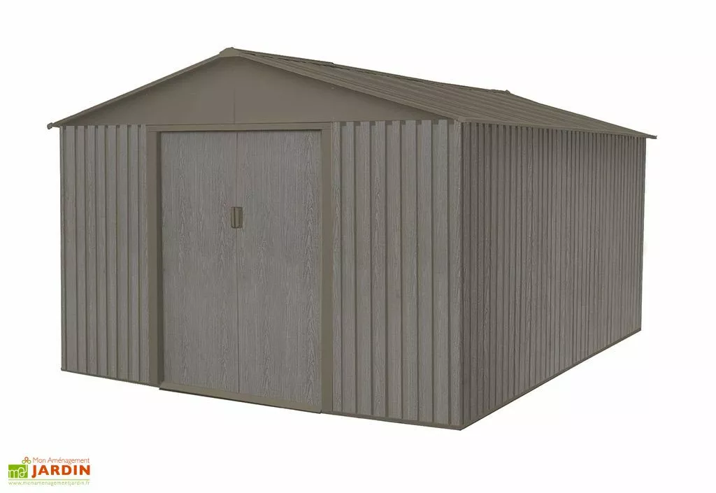 L’abri de jardin en métal imite l’aspect du bois vieilli pour une intégration parfaite dans le jardin, allant même jusqu’à imiter les veines du bois. Il est équipé d’une double porte coulissante de 130 x 157 cm (l,h) et dispose de parois de 160 cm de hauteur et 0,25 mm d’épaisseur.
