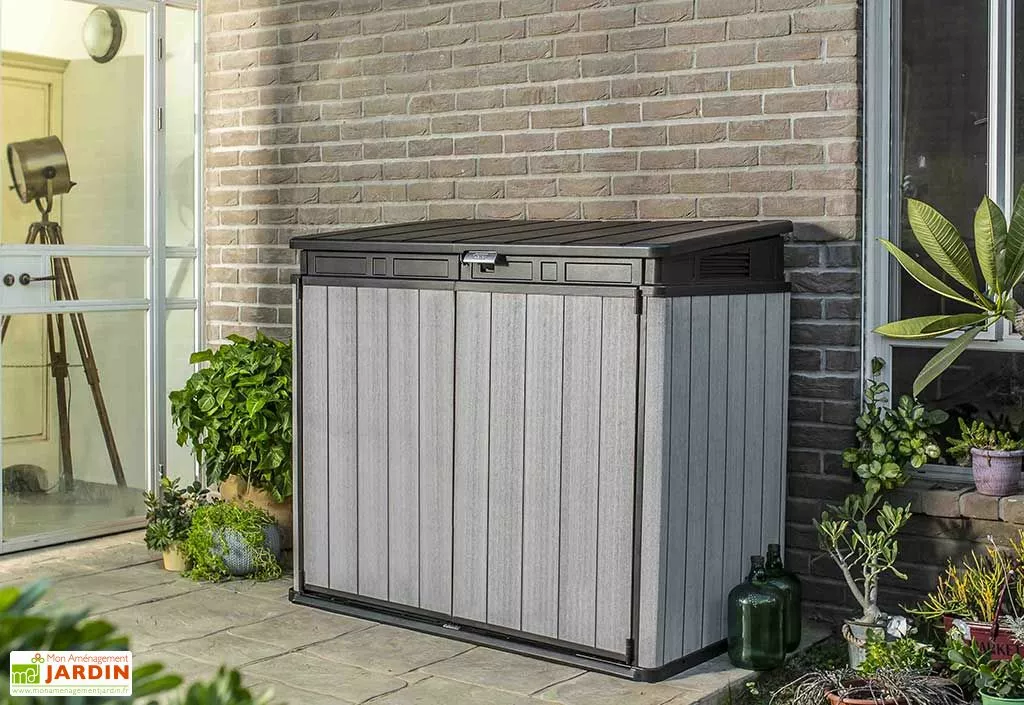 Le coffre de jardin Brossium de chez Chalêt-Jardin offre une solution de rangement efficace et polyvalente pour placer votre matériel de jardinage, vos outils ou vos coussins de salon de jardin à l’abri des intempéries. Il pourra même faire office d’abri pour poubelles (convient pour les conteneurs de 240 L) grâce à sa double porte frontale et à son couvercle monté sur pistons hydrauliques. Notez que ce coffre d’extérieur est verrouillable (cadenas non inclus), vous permettant ainsi de sécuriser son contenu.