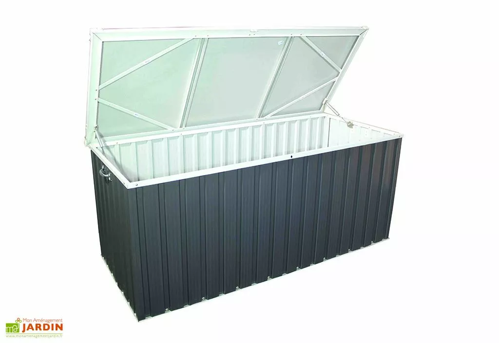 Ce coffre de jardin de chez Duramax est fabriqué en métal à partir de panneaux renforcés offrant une meilleure rigidité. Son couvercle dispose d’un système d’ouverture et de fermeture par vérins à gaz. Il mesure 174 ccm de longueur, 73 cm de profondeur et 73 cm de hauteur offrant près d’un mètre cube de rangement.