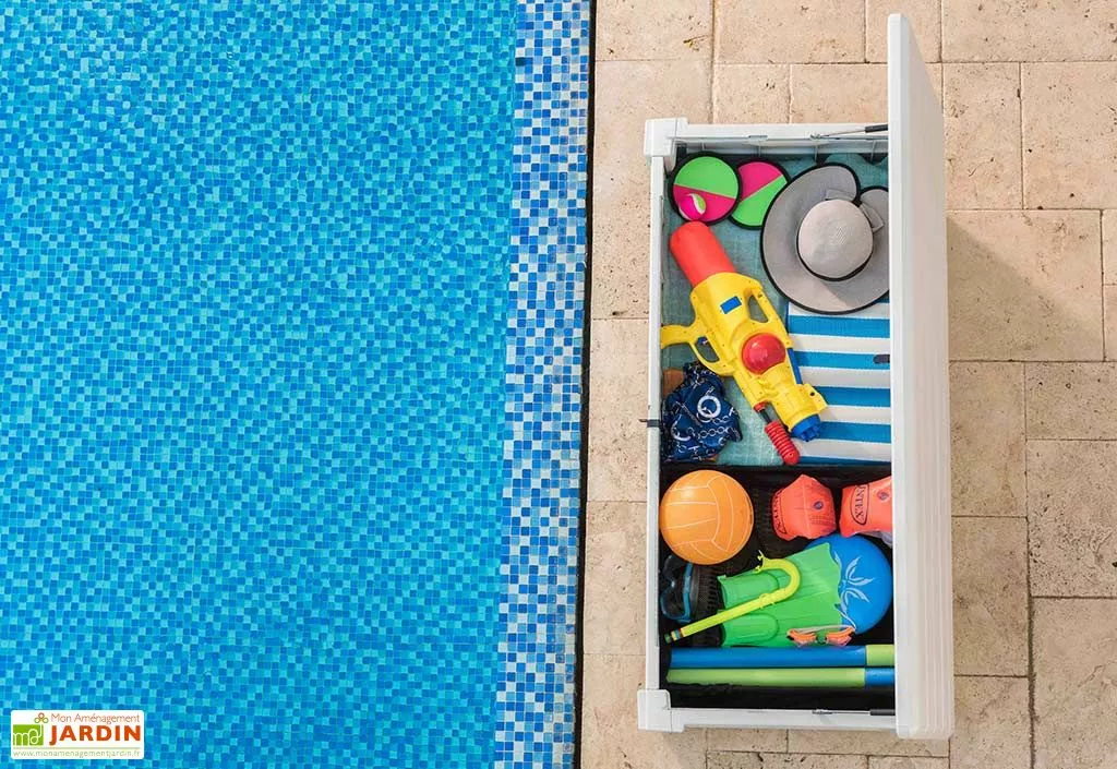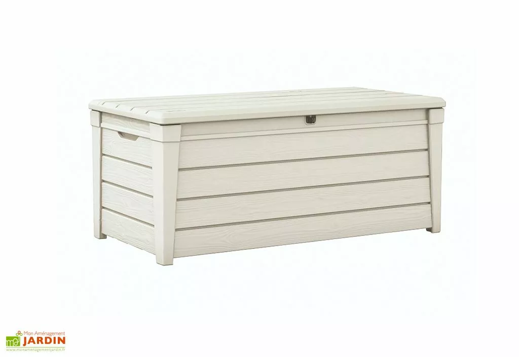 Le coffre de jardin Keter Pool Box a spécialement été pensé pour la piscine. En effet, il propose une belle contenance de 455 litres et bénéficie de rangements organisés grâce à la présence d’un filet de rangement et d’un panier de suspension. Son design imitation bois peint en blanc s’intègre parfaitement aux abords de la piscine.