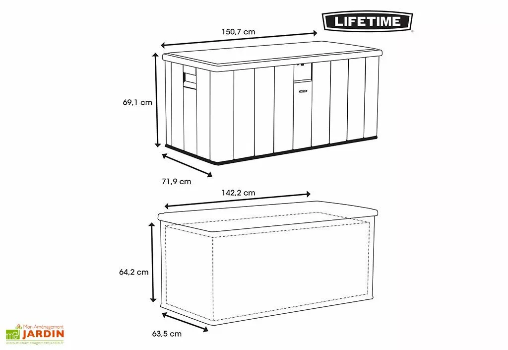 Le coffre de rangement Lifetime possède une contenance de 567,8 litres grâce à ses dimensions de 71,9 cm de profondeur, 150,7 cm de largeur et 69,1 cm de hauteur. Il s’installe dans le jardin, dans le garage ou dans la maison pour vous permettre de protéger vos équipements de piscines, coussins de mobiliers ou encore les jouets des enfants.