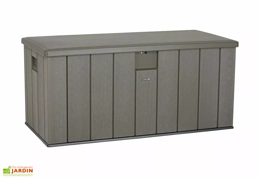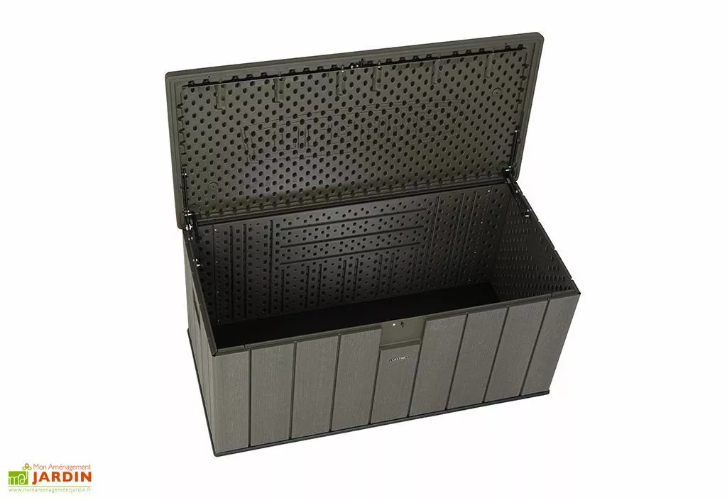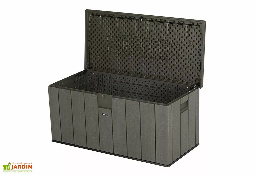 Le coffre est en polyéthylène haute densité, un matériau résine parfaitement résistant aux agressions extérieures. Il ne craint pas la moisissure, il est insensible à la corrosion et aux attaques d’insectes. Pour une intégration parfaitement dans le jardin, le PVC imite parfaitement le bois. Vous profitez ainsi d’un coffre avec les avantages esthétiques du bois sans les inconvénients de l’entretien.