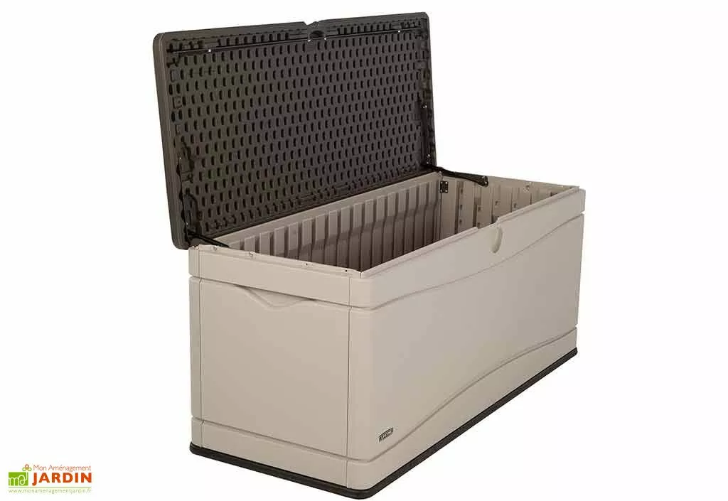 Votre coffre de rangement en résine de chez Lifetime mesure 1,52 x 0,61 x 0,67 m (l,l,h). Il est de couleur beige et marron, et son fond est noir. Très résistant, votre coffre double parois peut être utilisé comme banc. Il possède un traitement anti-UV. Son joint anti-intempéries vous permet de stocker vos affaires au sec. Le couvercle de votre coffre s’ouvre à plus de 90° et il est verrouillable. Des poignées sont moulées dans la parois extérieures pour un déplacement facilité. Votre coffre est garanti 10 ans.