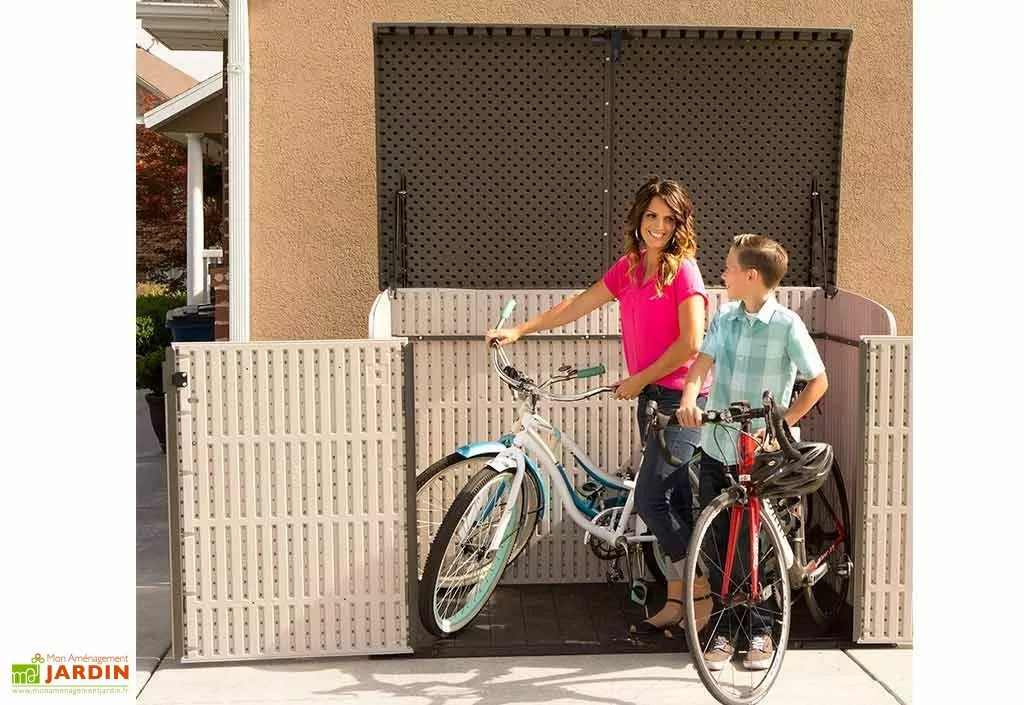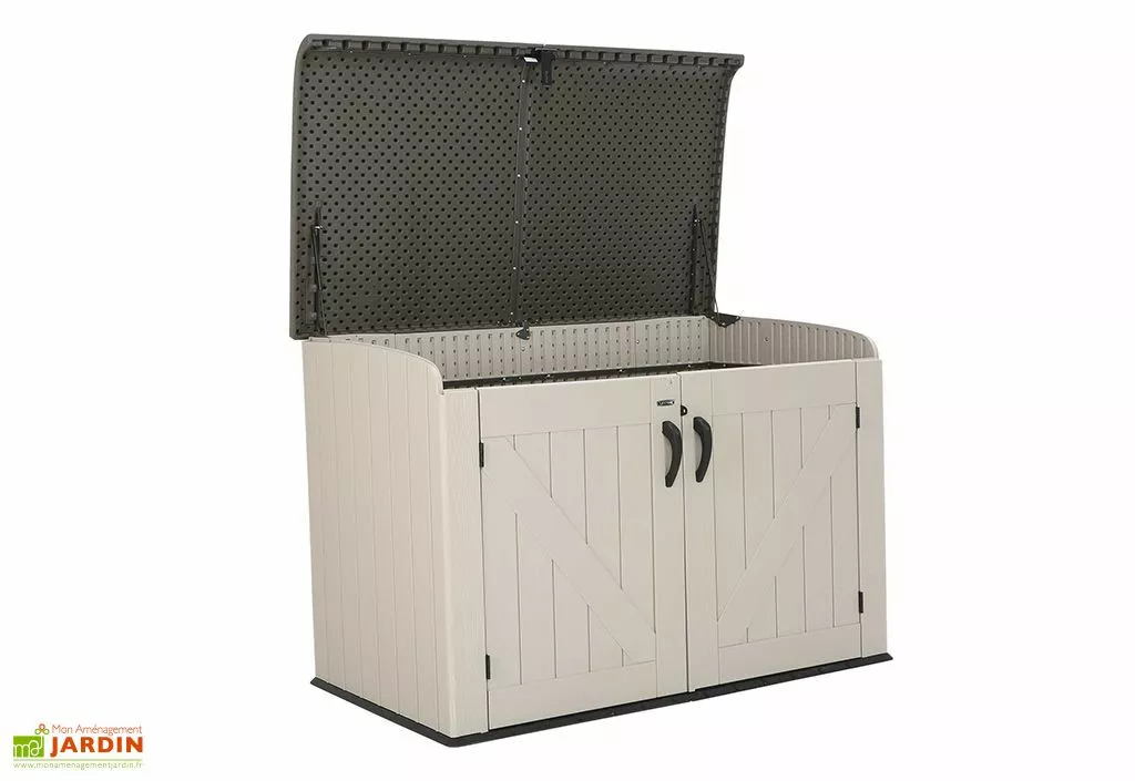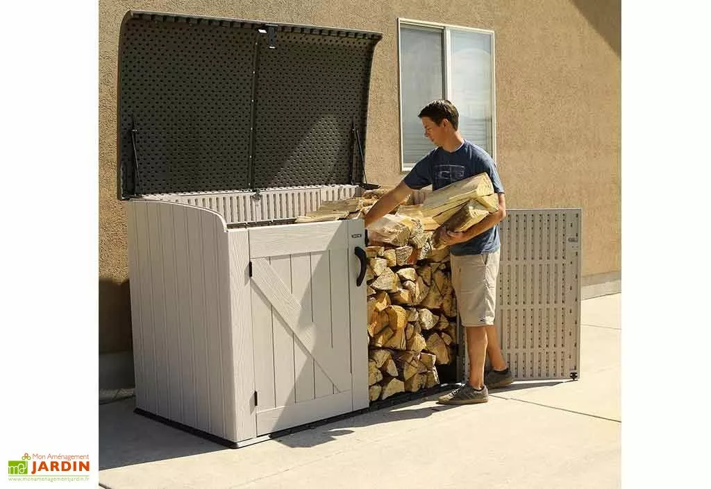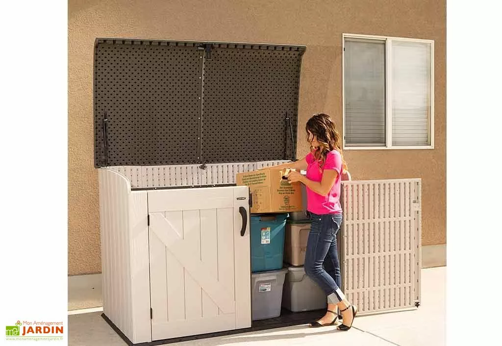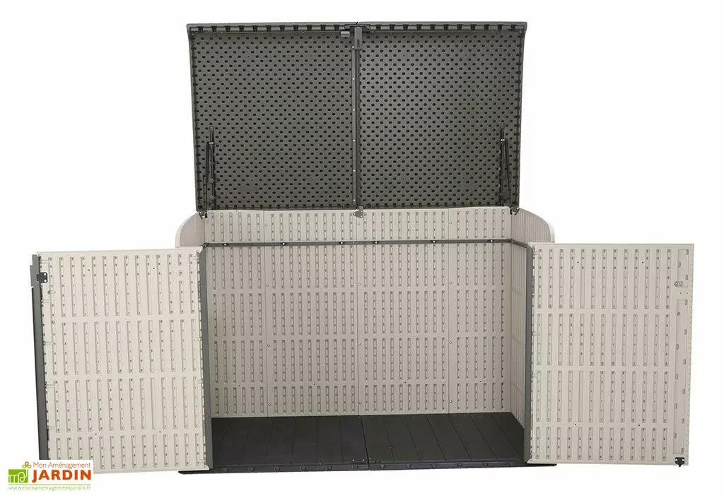 Le coffre de rangement mesure 107 cm de profondeur, 191 cm de largeur et 132 cm de hauteur. Les dimensions intérieures sont de : 180.9 x 97.8 x 118.7 cm. Il est en polyéthylène haute densité, un matériau qui résiste parfaitement à la moisissure, à la corrosion, aux attaques d’insectes et aux chocs. Il ne demande aucun entretien. Il peut contenir jusqu’à 2 124 litres. Idéal pour les vélos, le bois, les poubelles ou les équipements de jardin.