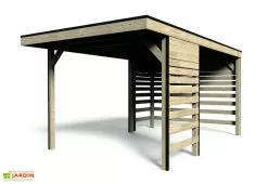 Les parois de cet abri en bois accueillent une toiture plate fabriquée en OSB et recouverte d’une toile bitumée de 1,5 mm d’épaisseur. Cette dernière est légèrement inclinée, ce qui permet de faciliter l’écoulement des eaux pluviales en cas d’averse. Notez enfin que l’accès à la partie abri de jardin se fera par une double porte vitrée de 167 x 173 cm.