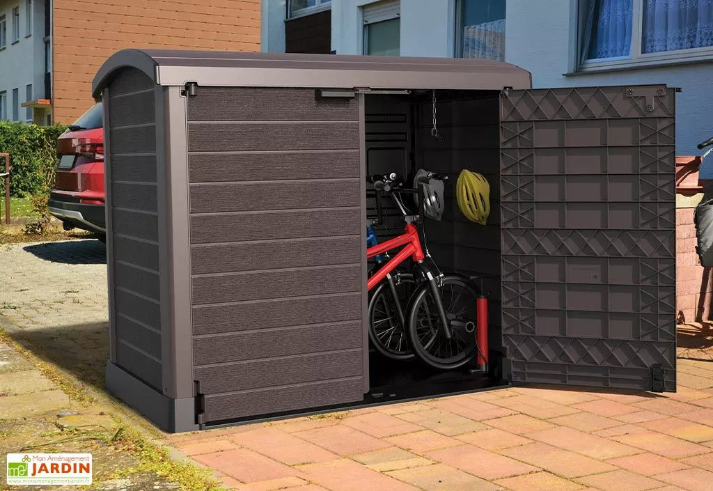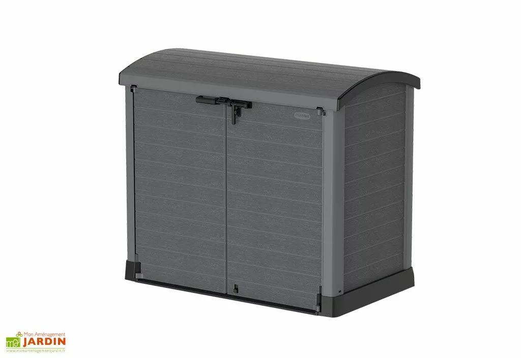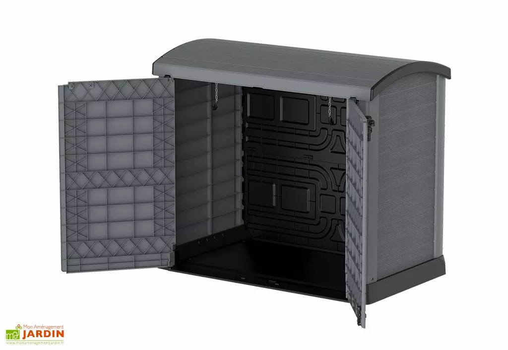 Cette armoire de rangement produite par Duramax, est parfaitement pensée pour accueillir des objets particulièrement volumineux. En effet, elle offre un volume intérieur de 1 200 L et pourra aisément stocker des outils ou du mobilier de jardin, mais également ranger vos poubelles pouvant parfois être disgracieuses au sein de vos extérieurs.