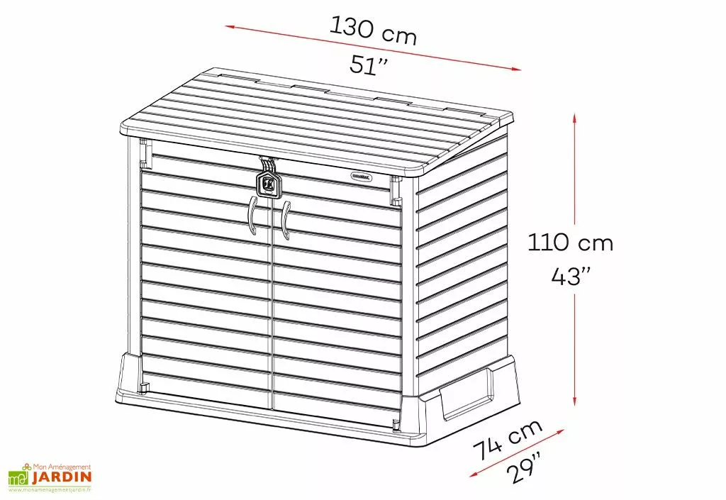 Avec son design parfaitement pensé pour accueillir des objets volumineux, cette armoire de jardin produite par Duramax vous sera d’une grande aide pour optimiser vos espaces. Son intérieur spacieux de 130 cm de longueur, de 74 cm de large, pour une hauteur de 110 cm, vous permettra d’y ranger vos outils de jardin, votre mobilier d’extérieur, ou encore de cacher vos poubelles.