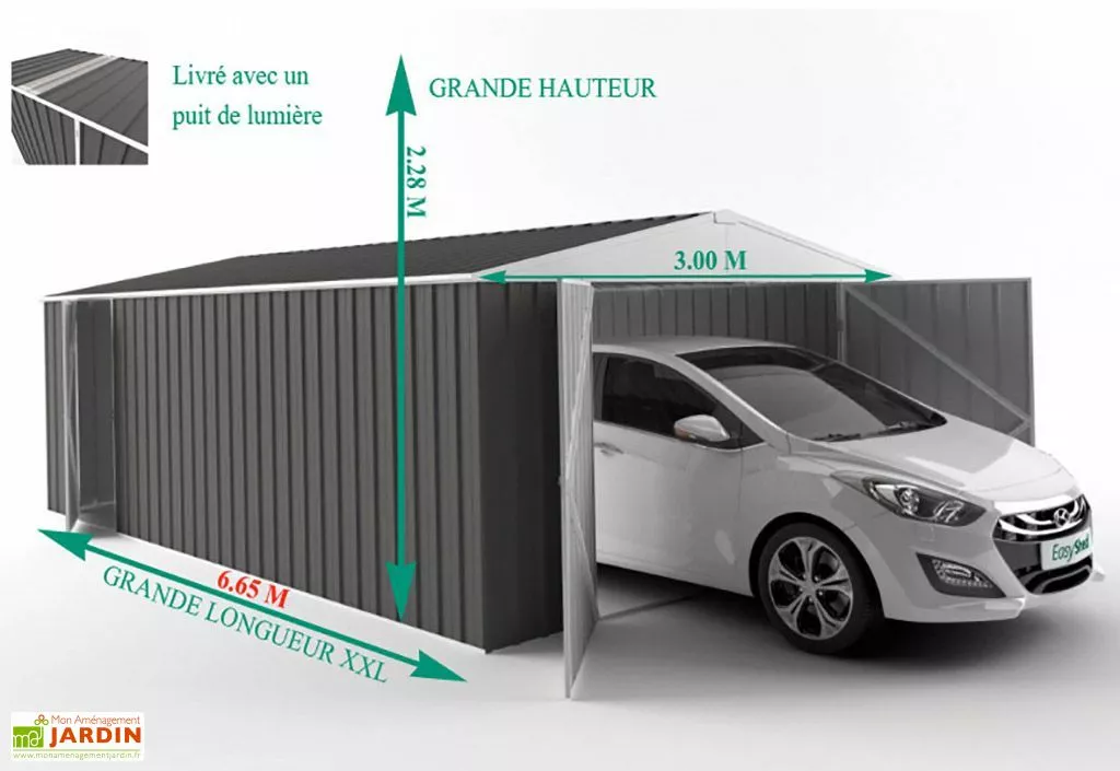 Le garage en métal XXL possède des dimensions hors tout de 6,65 x 3,00 x 2,10 m (l,l,h) soit une surface de 19,95 m². Sa superficie intérieure est de 19,47 m² et ses dimensions intérieures sont de 6,60 x 2,95 x 2,10 m (l,l,h).