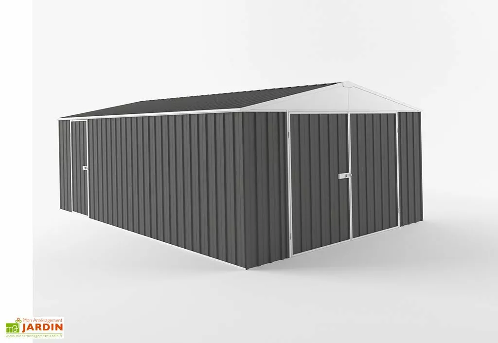 Le garage de grande longueur est équipé d’une double porte de 180 x 230 cm (l,h) et d’une porte latérale de 75 x 180 cm (l,h). Il est en acier zincalume galvanisé à chaud et les parois possèdent une épaisseur de 0,35 mm peintes en gris ardoise (RAL 7015). Il bénéficie d’une excellente résistance à la corrosion.