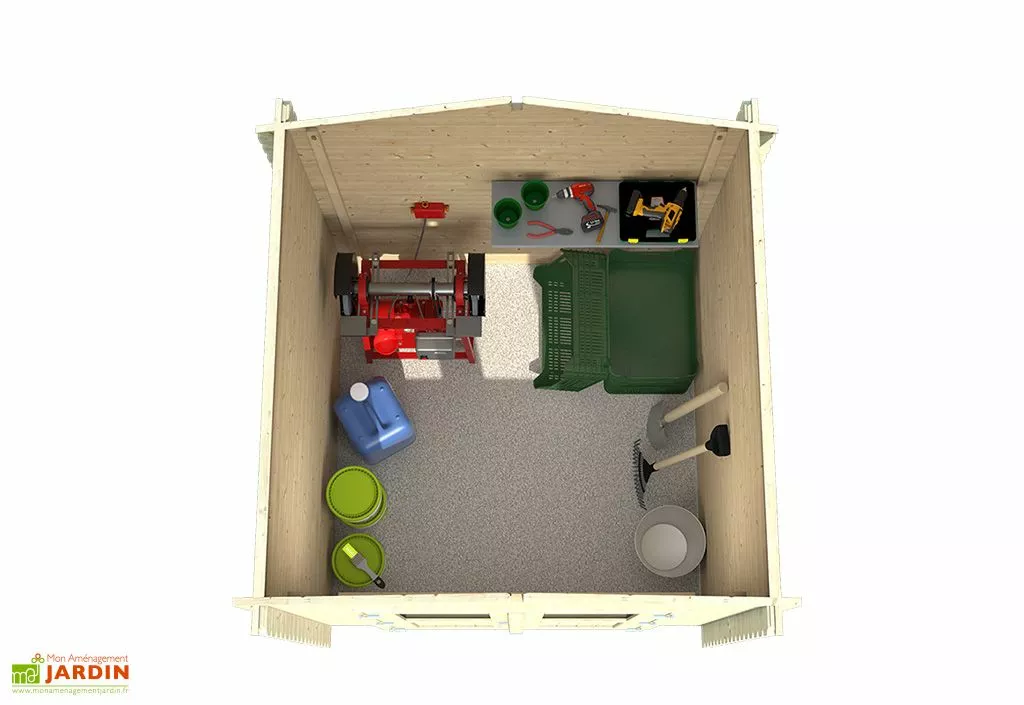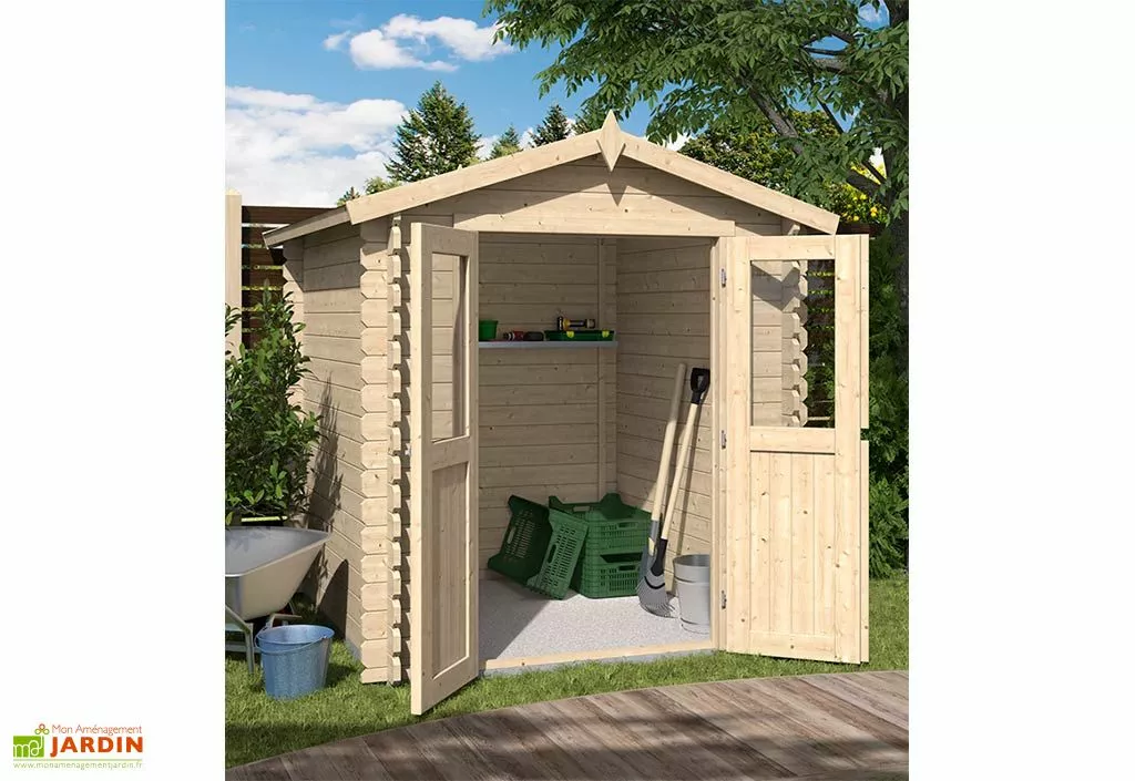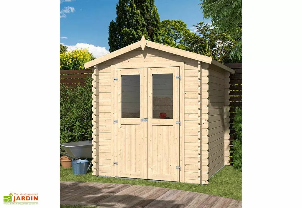 Les dimensions de l’abri sont de 220 x 220 cm, pour 214 cm de hauteur au faîtage. Les murs disposent d’une hauteur de 187 cm. Le cabanon en bois est équipé d’une porte double mi-vitrée avec des charnières pour faciliter l’ouverture et la fermeture, et il intègre un verrou targette pour la sécurité de vos outils. L’abri de jardin en bois est doté de voliges de 18 mm recouvertes d’un feutre bitumé noir pour protéger le toit des intempéries.
