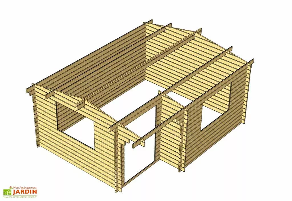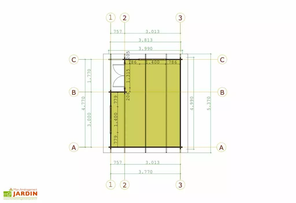 La toiture de l’abri de jardin,pouvant supporter une charge maximale de 40kg/m2, est constituée de poutrelles, recouvertes de volige de 18 mm d’épaisseur. Les dimensions extérieures de l’abri sont de 5 x 4 m (l,L). Les dimensions intérieures de l’abri sont : (3 x 3,77)+(1,77 x 3,01) m (l,p). Les dimensions extérieures hors tout de l’abri de jardin sont : 5,37 x 3,99 m (l,L ).