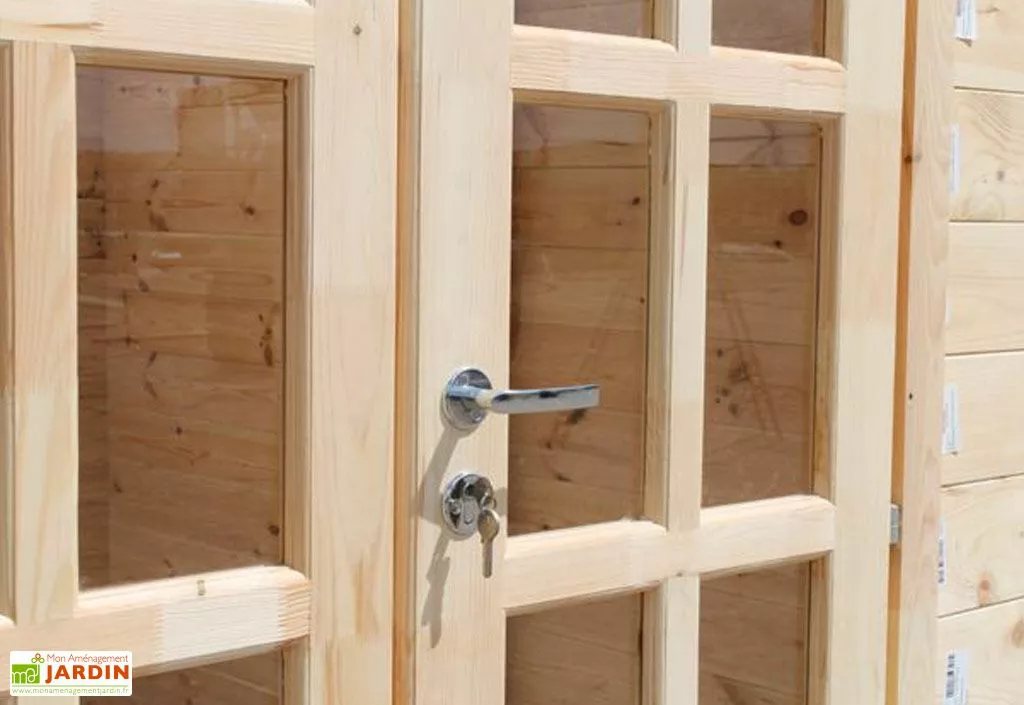 Votre chalet en bois Alpina est fabriqué par Eurovudas Ltd. Il est constitué de planches robustes en bois massif naturel de 44 mm d’épaisseur. Le montage est fait par simple emboîtement. L’abri de jardin dispose d’une entrée couverte avec une double porte pleine en bois deux ventaux semi vitrée avec double vitrage de dimensions 1,31 x 1,86 mm (l,h) avec poignée et serrure, de 2 fenêtres avec double vitrage de 1,38 X 0,91 m (l,h).