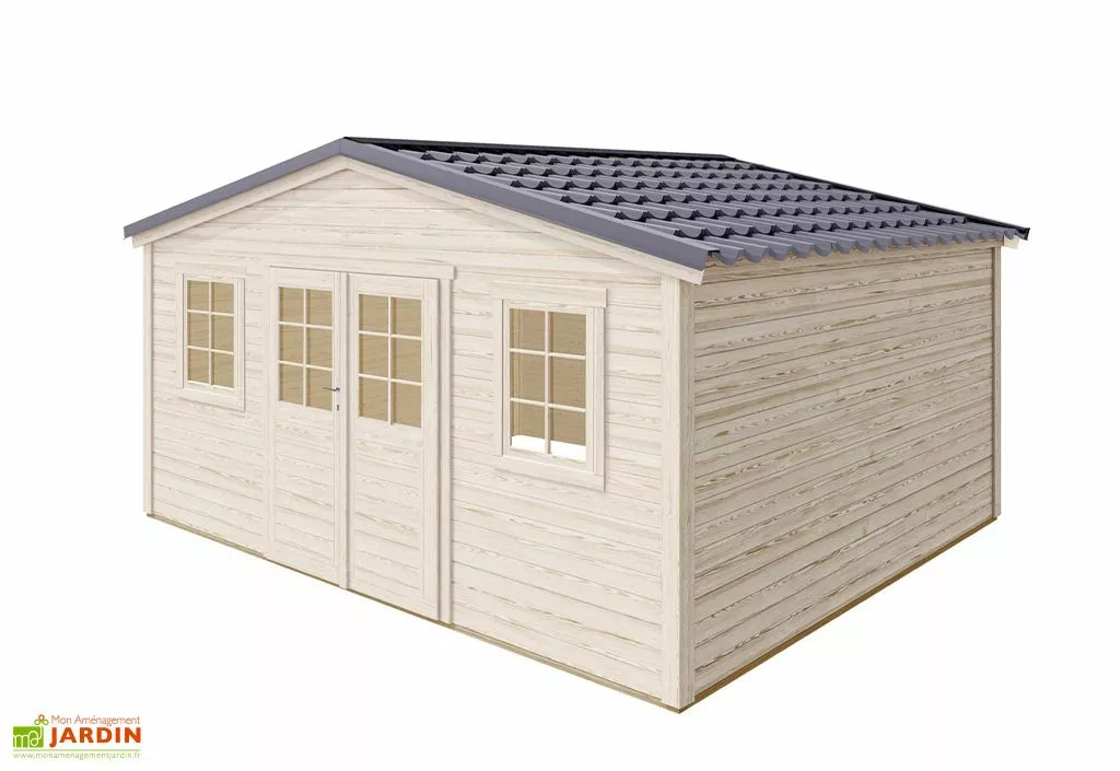 La toiture de cet abri en bois est composée de tuiles en acier galvanisé montées sur liteaux et contre liteaux avec pare-vapeur. Couvertes de peinture polyester, ces tuiles résistent bien à la corrosion et ne nécessitent que très peu d’entretien. La toiture et également conçue pour supporter une charge de neige de 75 kg/m². Il est toutefois recommandé de dégager régulièrement la neige accumulée sur le toit. Notez enfin que le tout est livré en kit. Vous devrez donc monter cet abri de jardin vous-même.