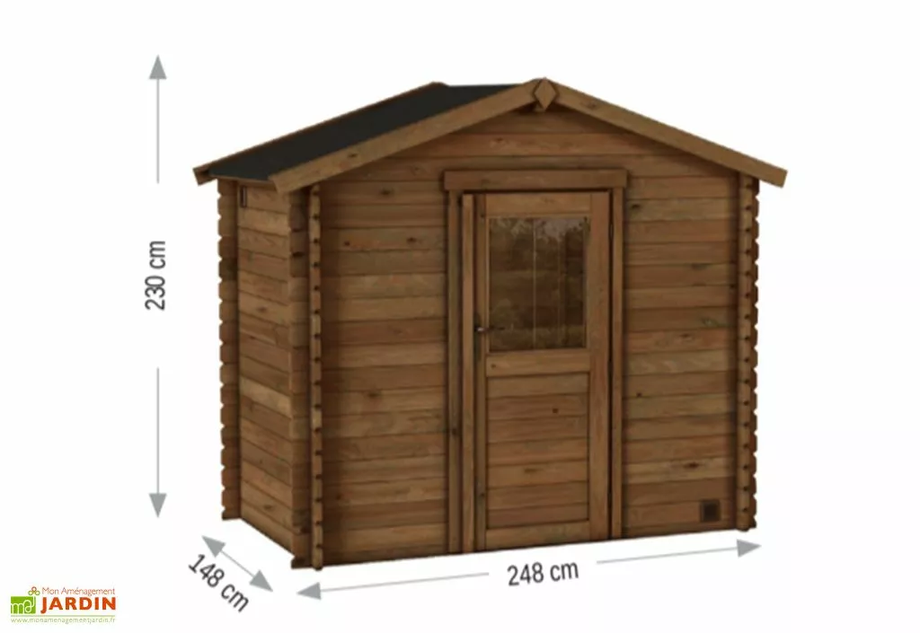 Doté d’une profondeur de 156 cm, d’une longueur de 269 cm et d’une hauteur de 230 cm, cet abri de jardin Nicia de chez Forest-Style est fabriqué à partir de madriers en bois d’épicéa FSC de 28 mm d’épaisseur. Le bois est traité autoclave classe 3, ce qui le bois des agressions extérieures telles que l’humidité, les insectes et champignons. Teinté, l’abri en bois n’a pas besoin d’être lasuré.