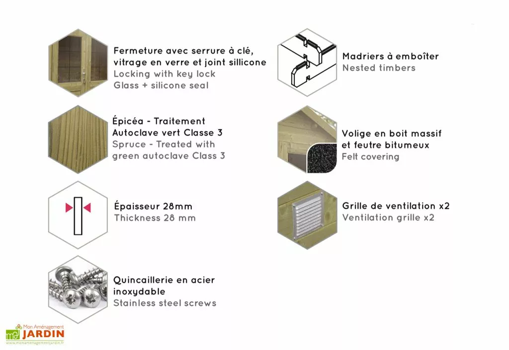 Cet abri de jardin Nicia Modern de chez Forest-Style est fabriqué à partir de madriers en bois d’épicéa FSC, sigle signifiant que le bois provient de forêts gérées dans le respect de l’environnement. Le montage des madriers est simple et rapide à installer, et assure un assemblage solide et étanche. Le toit légèrement incliné est équipé de voliges en bois massif et de feutre bitumeux, offrant une bonne étanchéité.