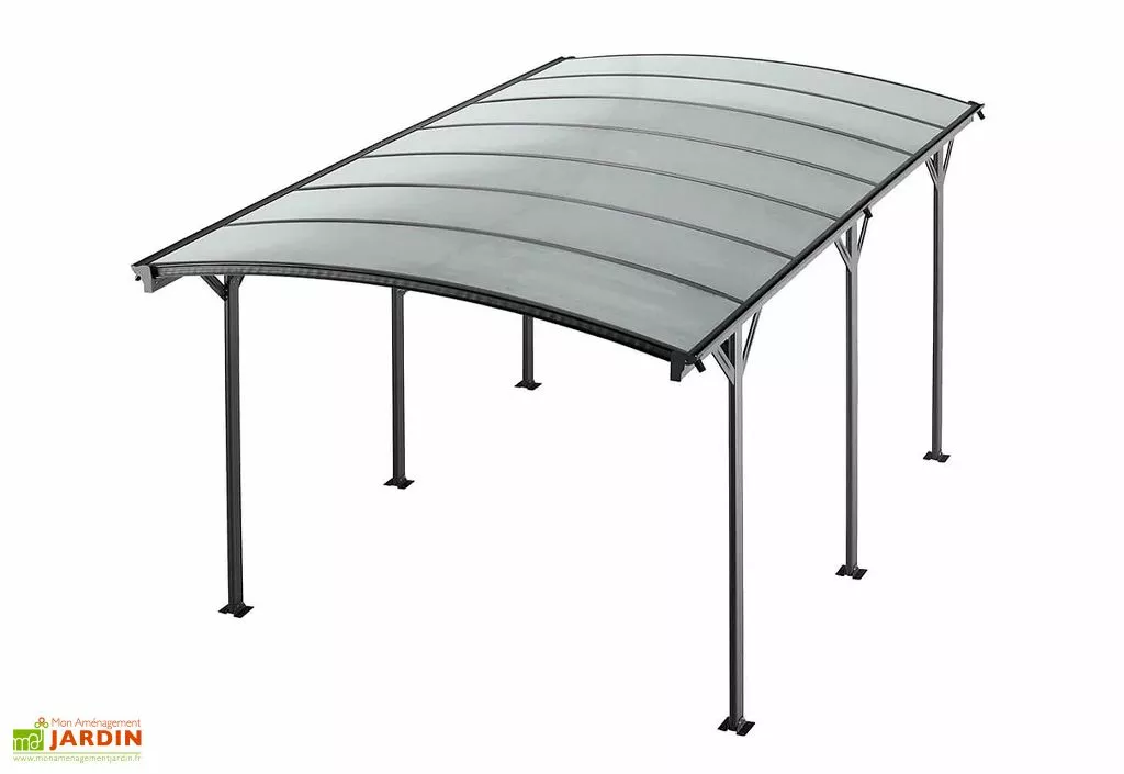 Ce carport en aluminium est revêtu d’une peinture gris anthracite pour une intégration aisée dans tous les jardins. Ses 6 poteaux de 10 x 4 cm de section lui offrent une excellent stabilité. Les poteaux pourront être fixés sur des plots en béton grâce au kit d’ancrage fourni. (Béton non fourni.)