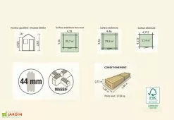 Les dimensions extérieures hors tout de l’abri en bois sont de 4,88 x 5,26 m (l,l). Les dimensions extérieures de l’abri sont de 3,98 x 4,98 x 2,77 m (l,l,h). Les dimensions intérieures sont de 3,69 x 4,69 m (l,l), pour une surface utile de 17,3 m². Votre abri de jardin de chez Galanis est livré en kit, à monter facilement soi-même, avec une notice de montage détaillée en français. Votre abri est garanti 5 ans.