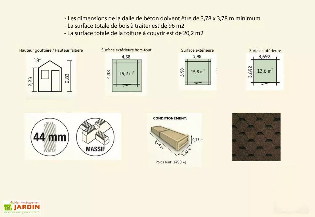 Les dimensions extérieures hors tout de l’abri de jardin sont de 4,38 x 4,38 m (l,l). Les dimensions extérieures de l’abri sont de 3,98 x 3,98 x 2,83 m (l,l,h ). Les dimensions intérieures sont de 3,69 x 3,69 m (l,l), pour une surface utile de 13,6 m². Votre abri de jardin de chez Galanis est livré en kit, à monter facilement soi-même, avec une notice de montage détaillée en français. Votre abri est garanti 5 ans.