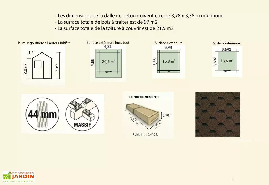 Les dimensions extérieures hors tout de l’abri de jardin sont de 4,88 x 4,21 m (l,l). Les dimensions extérieures de l’abri sont de 3,98 x 3,98 x 2,63 m (l,l,h). Les dimensions intérieures sont de 3,69 x 3,69 m (l,l), pour une surface utile de 13,6 m². Votre abri de jardin de chez Galanis est livré en kit, à monter facilement soi-même, avec une notice de montage détaillée en français. Votre abri est garanti 5 ans.