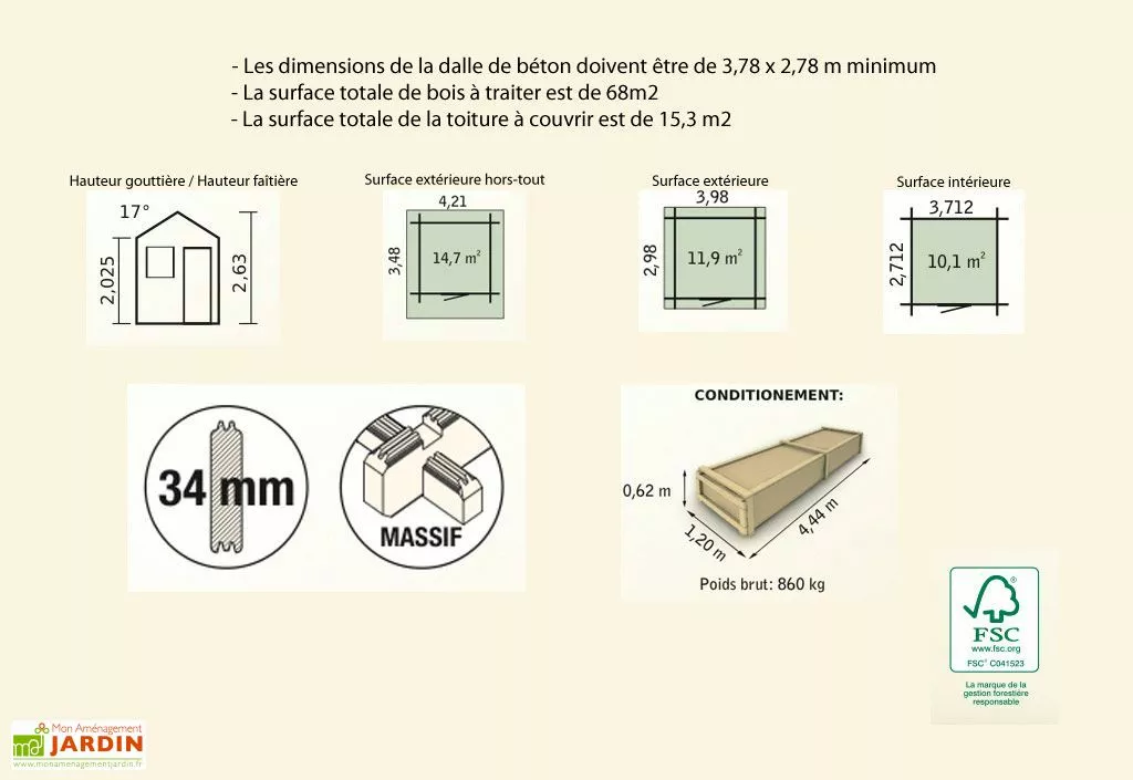 Vous pouvez installer votre chalet en bois sur une dalle ou sur des plots de bĂ©ton. Les dimensions extĂ©rieures hors tout sont de 4,21 x 3,48 m. Les dimensions extĂ©rieures de l’abri sont de 3,98 x 2,98 x 2,63 m et l’intĂ©rieur mesure 3,71 x 2,71 m, pour une surface utile de 10,1 mÂČ.Â