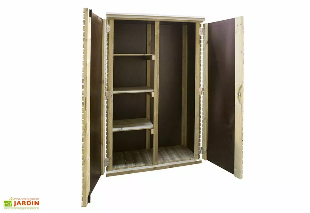 L’armoire est en planches de 16 x 38 mm et dispose d’un panneau baccélisé à l’intérieur des parois et sur la toiture. Elle ne craint pas la pluie et vos équipements de jardin sont protégés. Elle dispose de 3 étagères à installer sur la gauche ou sur la droite. Une serrure cylindre permet de sécuriser vos affaires. L’armoire est livrée avec son plancher pré-monté.