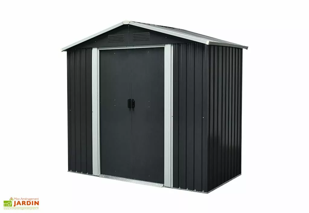 Idéal pour les petits espaces, cet abri de jardin en métal mesure 1,94 m de large sur seulement 1,31 m de profondeur. Il n’occupera ainsi que 2,54 m² et vous permettra de ranger du matériel de jardinage ou des outils, entre autres. Sa porte coulissante de 82 x 154 cm facilitera l’accès à l’intérieur de la cabane tandis que ses grilles d’aération permettront le renouvellement de l’air, évitant ainsi tout excès d’humidité.