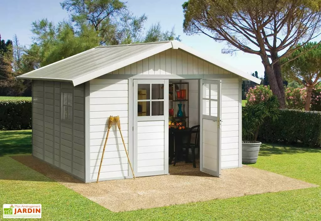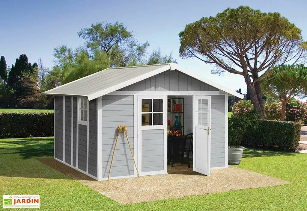 Votre abri de jardin PVC Deco 11 de chez Grosfillex est de fabrication française. L’abri mesure : 3,70 x 4,07 x 2,50 m (l,l,h) hors tout. Il a des parois de 26 mm d’épaisseur. La toiture, en lames PVC menuisées, a une pente à 36%. Les deux portes vitrées sont livrées avec une poignée et mesurent : 145 x 180 cm (l,h). Elles sont équipées de deux doubles vitres de 56,2 x 59,5 cm (l,h) et de 56,2 x 27,2 cm (l,h).