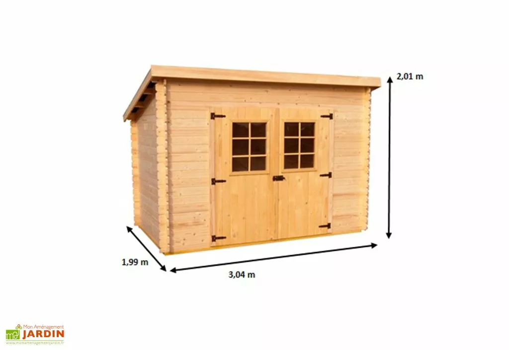 Ce cabanon de jardin affiche des dimensions hors tout de 1,99 x 3,04 m, pour 2,01 m de haut. Il occupera donc une surface de 6,05 m² une fois monté (espace intérieur : 4,59 m²). Résolument moderne, il dispose d’une toiture monopente couverte de plaques ondulées bitumées.
