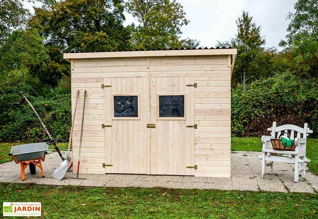 Cet abri de jardin Habrita est doté de parois constituées de panneaux de 16 mm d’épaisseur. Ces cloisons sont fabriquées en épicéa massif brut, donc non protégé contre l’humidité, les insectes et autres champignons. Vous devrez alors traiter vous-même chaque pièce de bois en ayant recours à un agent insecticide/fongicide ainsi qu’à une lasure. Notez qu’il vous faudra traiter l’intérieur et l’extérieur de l’abri juste après son montage.