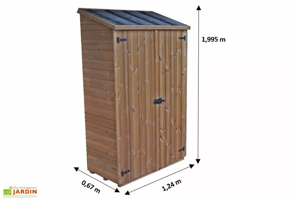 Ce cabanon de jardin mesure 124 cm de longueur, 67 cm de profondeur et 199,5 cm de hauteur à l’arrière. Il est composé de parois de 19 mm d’épaisseur et d’une toiture en pente revêtue de feutre bitumé. Sa double porte de 120 x 174 cm (l,h) donne sur un espace intérieur de 0,65 m² dans lequel vous retrouverez trois étagères de rangement. Un plancher en sapin brut complète le tout.