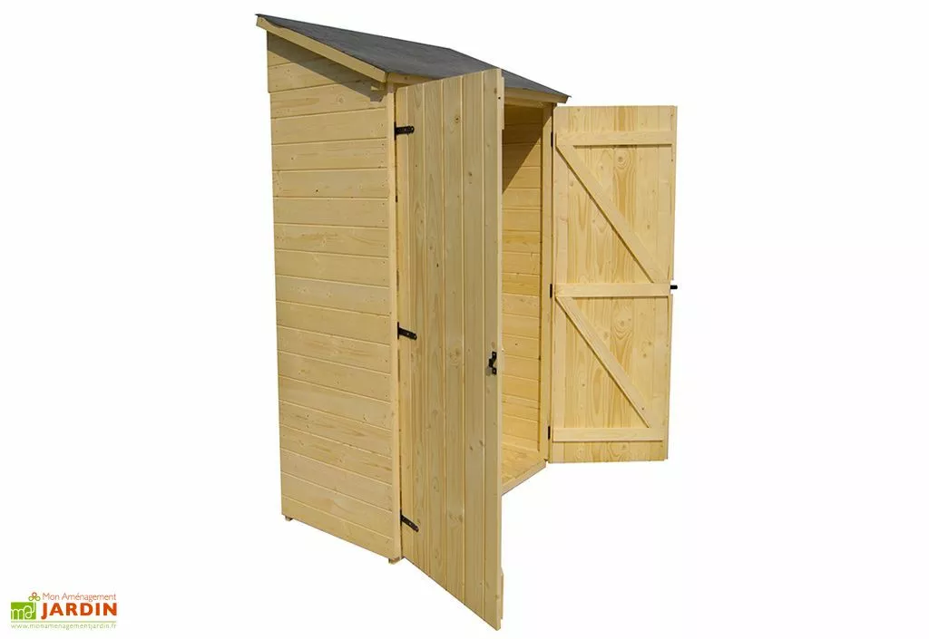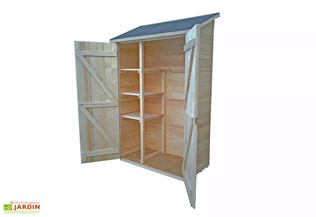 Pratique, l’armoire est équipée d’une grande double porte, chacune de 55 cm de largeur et 169 cm de hauteur et de 3 étagères de 37,5 cm de large afin de stocker du matériel de jardin avec facilité.