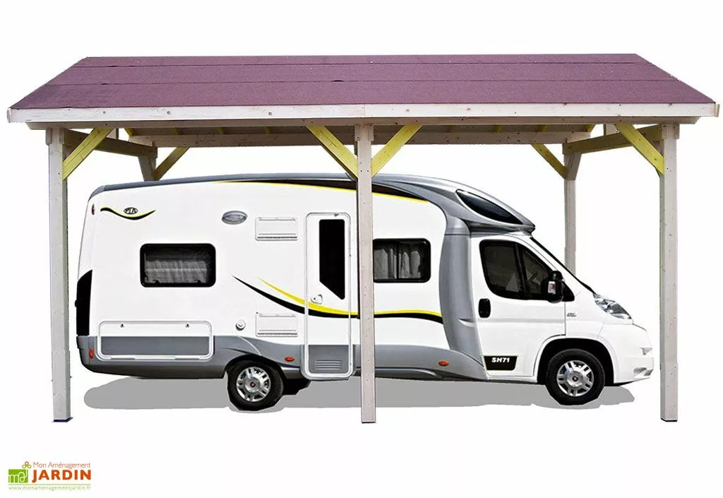 Votre carport spécial camping-car de chez Habrita mesure au sol 3,5 x 6 m et hors tout 4 x 6,3 x 4,57 m (l,l,h) pour une hauteur de passage de 3,34 m. Il dispose d’un débord de toit de 15 cm sur l’avant et l’arrière et de 25 cm sur les côtés. Ce carport de fabrication française est en sapin contrecollé PEFC. Les 6 poteaux en lamellé-collé font 12 x 12 cm de section, les chevrons en bois massif sont recouverts par des voliges en planches rabotées et de bardeau bitumé. Livré brut à lasurer, vous pourrez choisir dans vos options si vous souhaitez la prestation de montage. La garantie est de 2 ans.