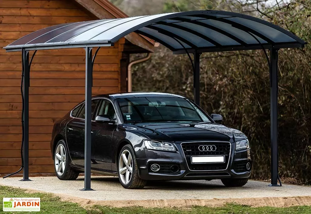 Le carport permet de couvrir une voiture. Sa hauteur de passage est de 2,05 m. Il dispose de gouttières latérales permettant d’acheminer l’eau de pluie. Ses pièces de raccordement sont en acier. Il bénéficie d’une garantie de 5 ans contre la déformation de la structure et de 2 ans sur la couverture.