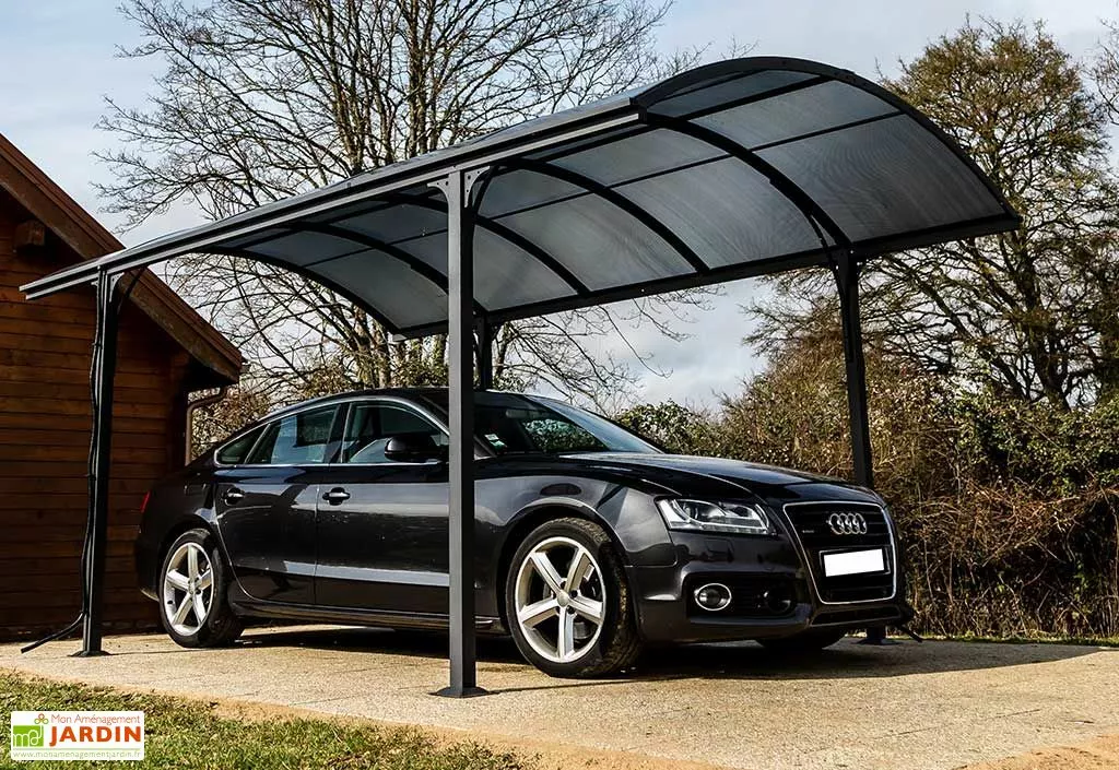 Le carport dispose d’une structure en aluminium gris anthracite de 1,4 mm d’épaisseur. L’aluminium résiste parfaitement à la corrosion et ne demande aucun entretien. Le coloris gris anthracite s’intègre parfaitement dans tout type de jardin, offrant un look contemporain. La modernité du design est renforcée par la toiture arrondi de l’abri.