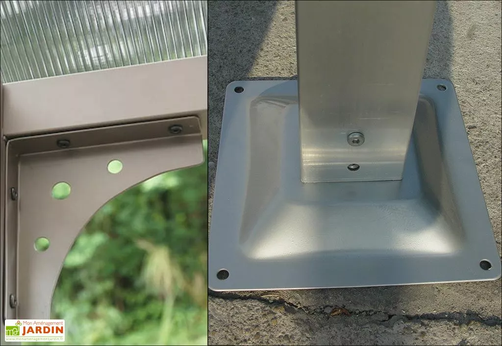 Le carport est autoportant et monté sur 4 poteaux de 7 x 7 cm de section. Des platines de fixation sont intégrées à chaque pied afin de l’ancrer solidement au sol avec des chevilles à expansion pour béton. Il bénéficie d’une visserie en inox ce qui le rend particulièrement adapté à une utilisation près de la mer puisque l’acier inoxydable ne craint pas la corrosion.
