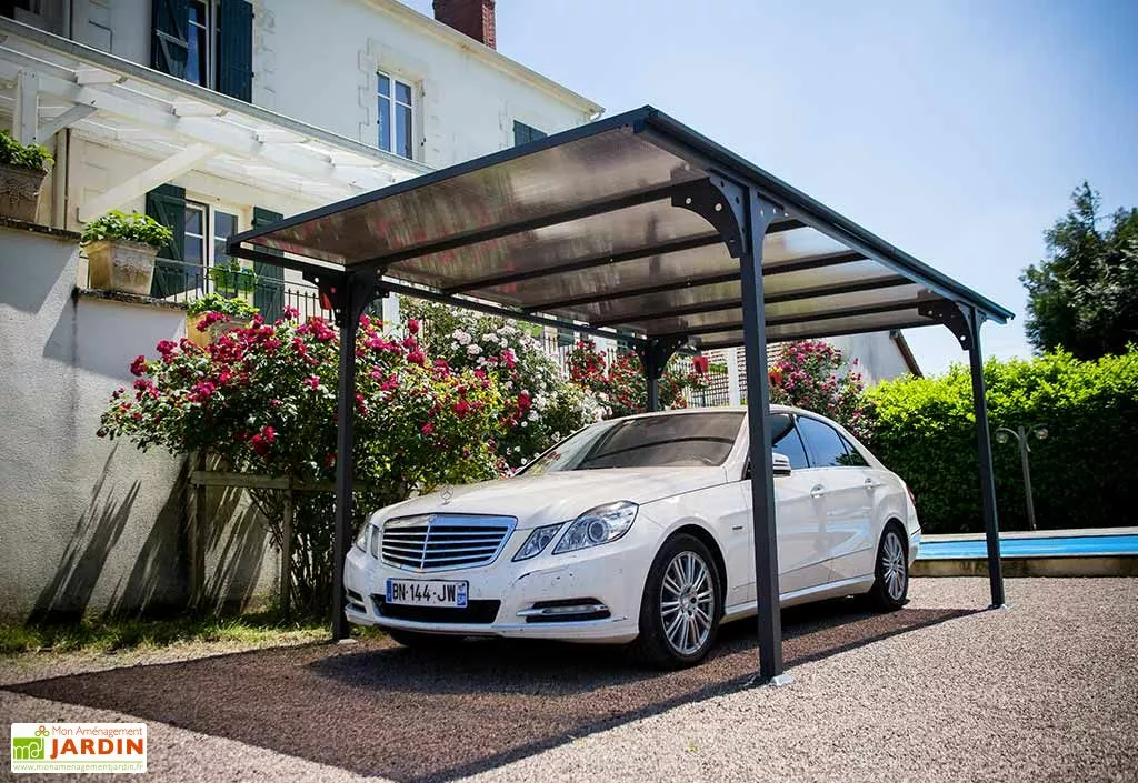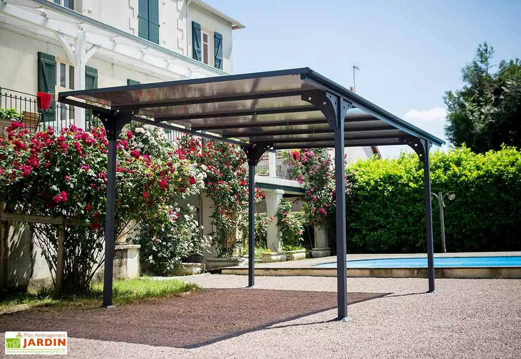 Le toit plat est recouvert de plaques de polycarbonate de 6 mm traitées anti UV. Ces plaques de polycarbonate nouvelle génération sont translucides et foncées. Elles réduisent la chaleur sous le carport. La légère pente de toit et la gouttière latérale permettent d’évacuer l’eau de pluie aisément.