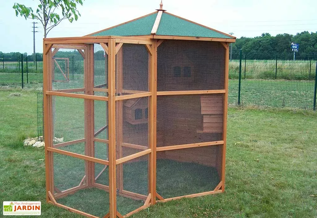 La volière est livrée directement chez vous, en kit, prête à être montée. Le maillage fait 1 x 1 cm. La garantie est de 2 ans.